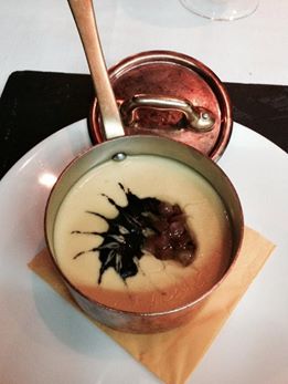 1. Суп-пюре из нежной кукурузы с нарезкой хамона, лангустинами и под соусом из кукурузного грибка