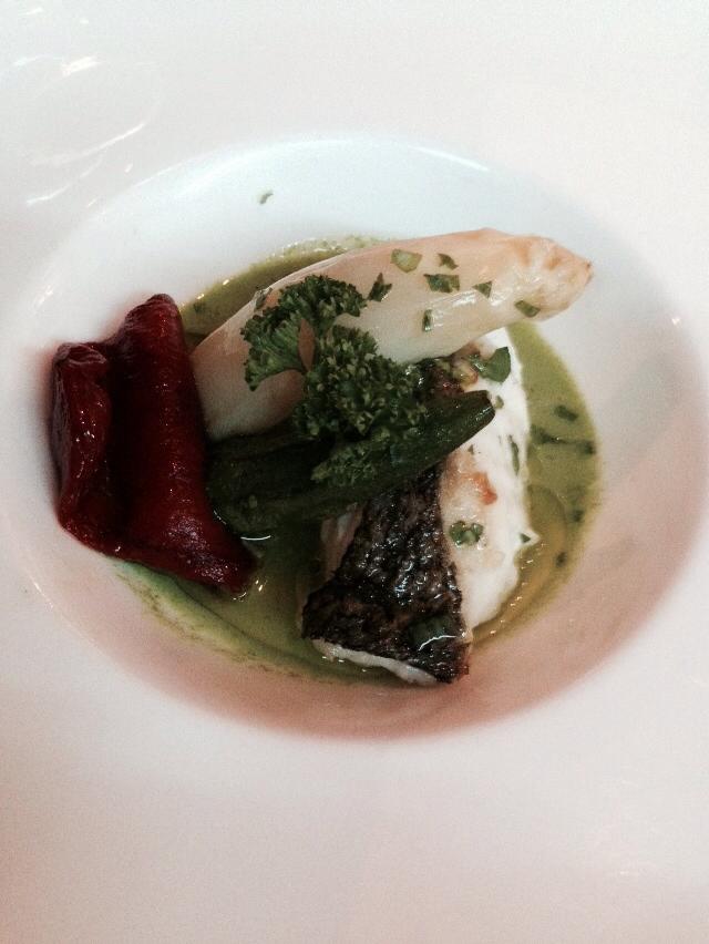 5. Хек Северного моря в зеленом соусе с верхушкой спаржи, первым зеленым горошком и прозрачным красным перчиком в оливковом масле